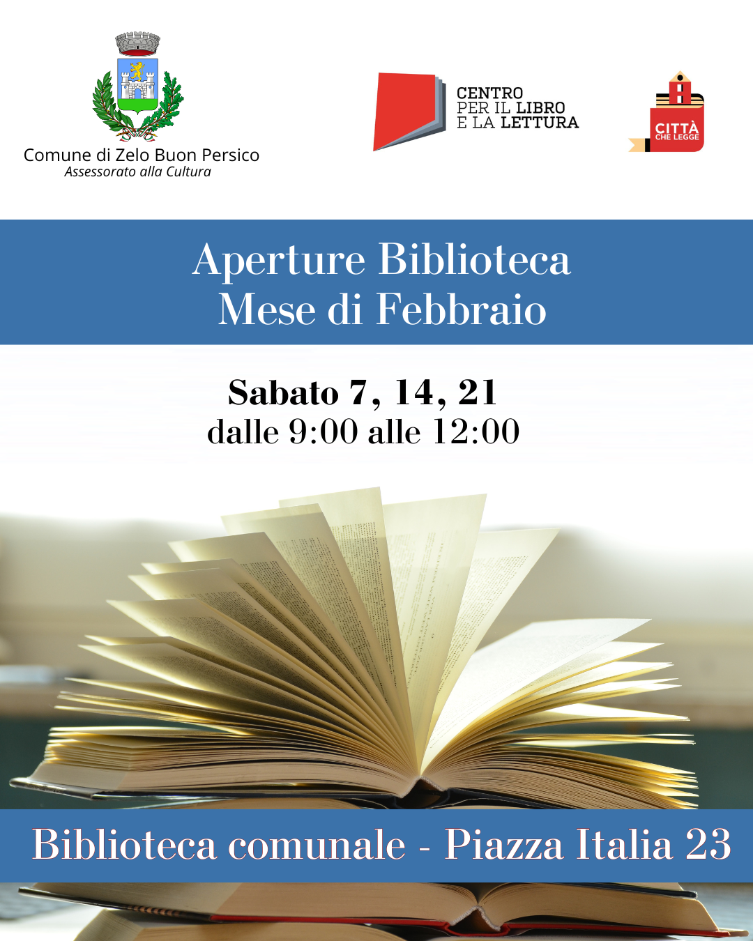L'Assessorato alla Cultura del Comune di Zelo Buon Persico informa i cittadini che la Biblioteca aprirà anche anche Sabato 7, Sabato 14 e Sabato 21 febbraio dalle 9.00 alle 12.00