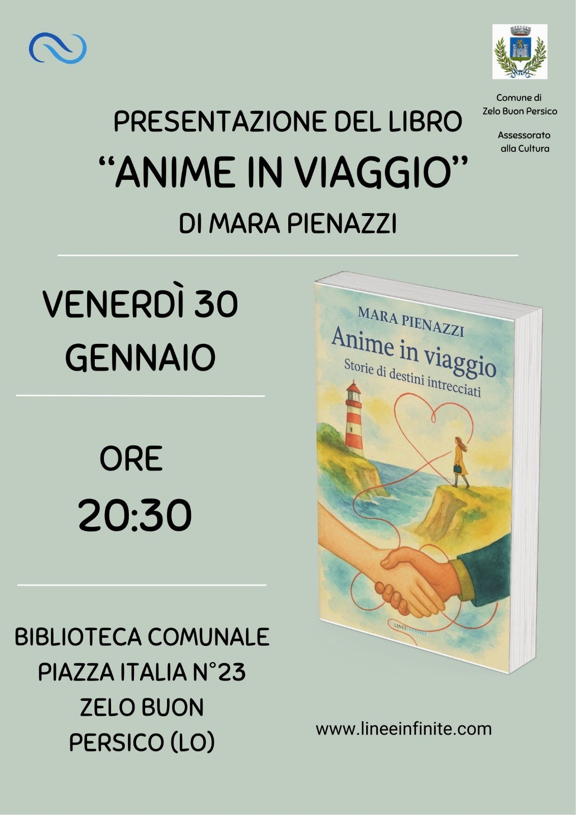 L'Assessorato alla Cultura del Comune di Zelo Buon Persico propone la presentazione del libro dal titolo "Anime in viaggio" con la presenza dell'autrice Marina Pienazzi venerdì 30 gennaio alle ore 20.30 presso la Biblioteca Comunale di Piazza Italia 23.